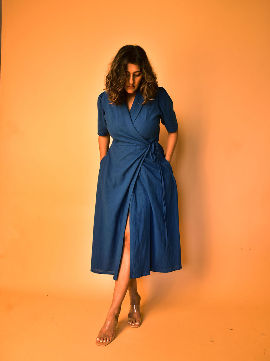 A long, chic wrap dress perfect for turning heads this season! Cut in deep ink blue cotton, this wrap dress is designed with lapel neckline, short pleated sleeves and a tapered skirt. Pair with black heels for a boardroom-to-bar look.