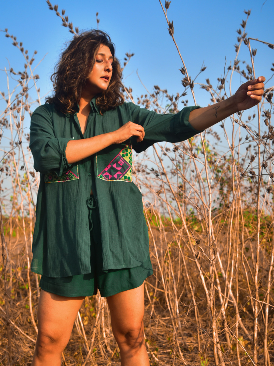 This oversized shirt is made for desk to dinner, cut in deep green cotton with contrast patchwork pockets (the print may vary based on availability). Pair with our Nina Shorts and sneakers to complete the lounge look.
