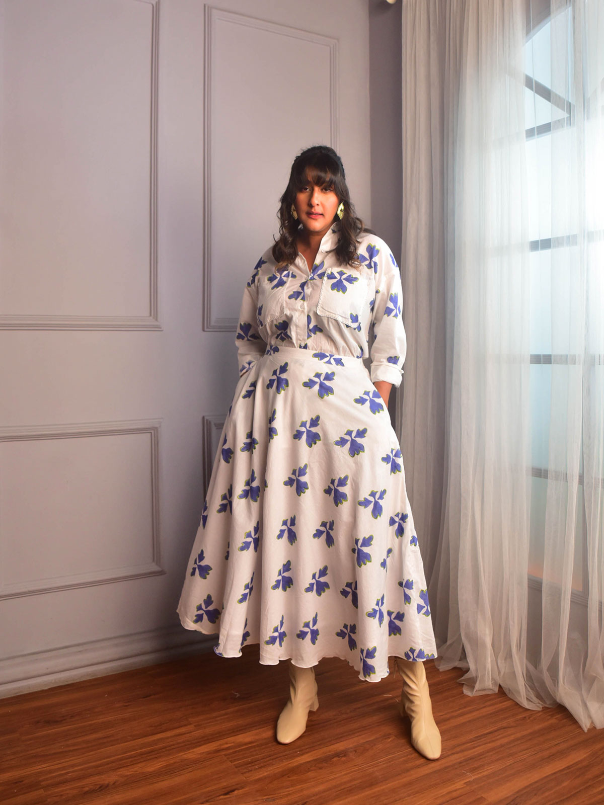 A billowy flared skirt for the festive season! Cut in our exclusive blue and white floral block-printed cotton, this classic Umbrella skirt with a waist band and two inseam pockets.